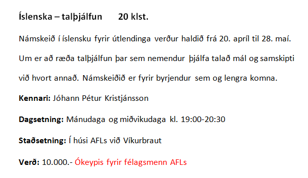 Námskeið í íslensku fyrir útlendinga verður haldið frá 20. apríl til 28. maí. Um er að ræða talþjálfun þar sem nemendur þjálfa talað mál og samskipti við hvort annað. Námskeiðið er fyrir byrjendur sem og lengra komna.