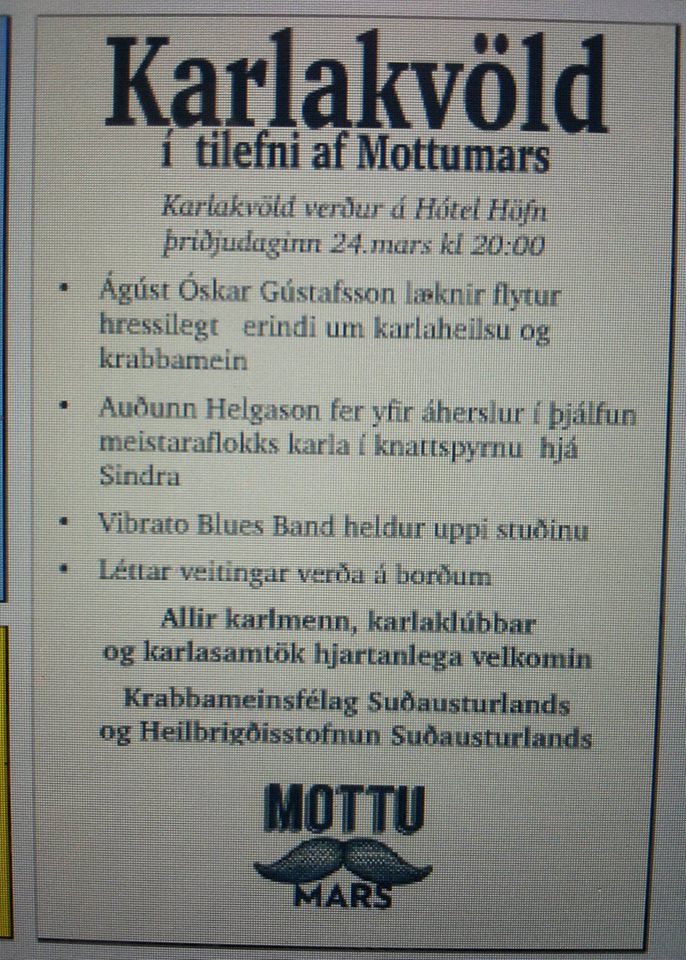 Karlakvöld verður á Hótel Höfn þriðjudagskvöldið 24.mars.
