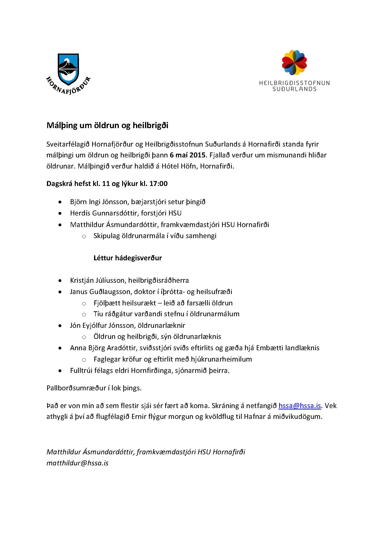 Málþing á vegum Heilbrigðisstofnunar Suðurlands á Hornafirði og Sveitarfélagsins Hornafjarðar. Spennandi fyrirlesarar þar sem fjallað verður um málefni aldraðra í víðu samhengi.